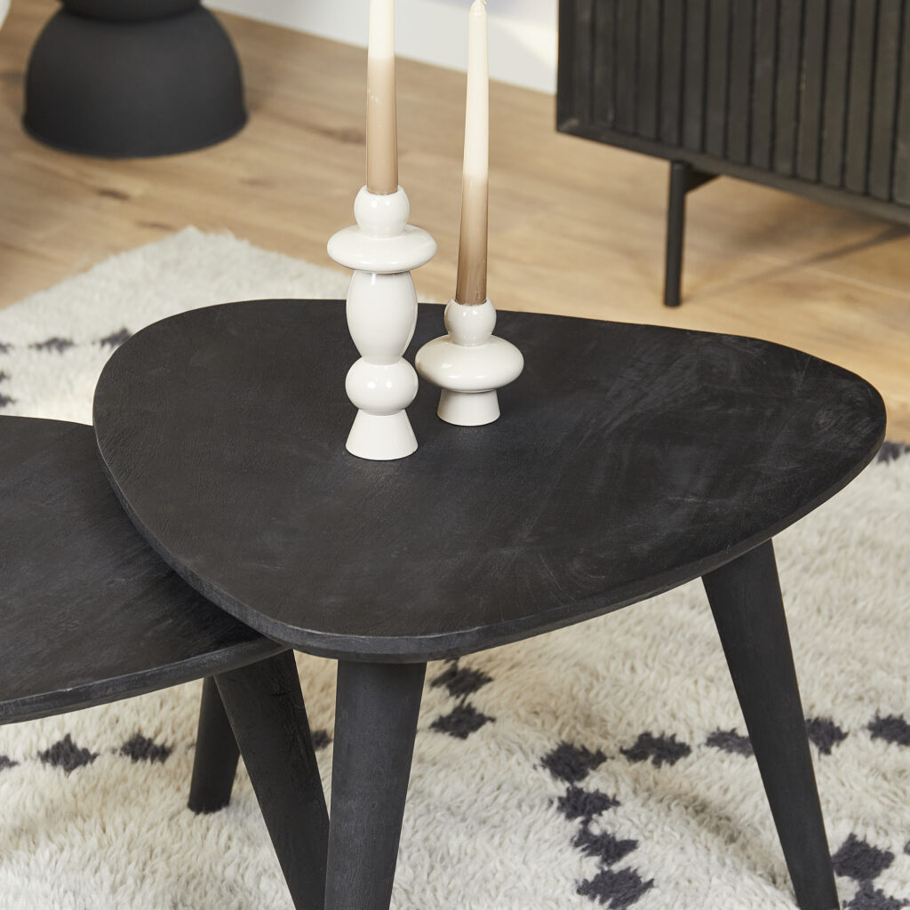 Salontafel set van 2 Omaha Black is volledig uitgevoerd in mangohout. De vorm van de salontafel is driehoekig en heeft drie houten poten. De salontafel is ingelegd met verschillende stroken zwart gelakt hout, waar het meubel zijn eigentijdse karakter aan te danken heeft.